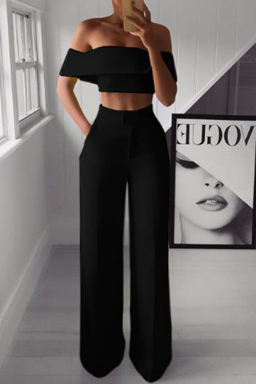 Kathiadress Chic Solid Boat Neck Off Shoulder Top+Loose Pants Two-piece